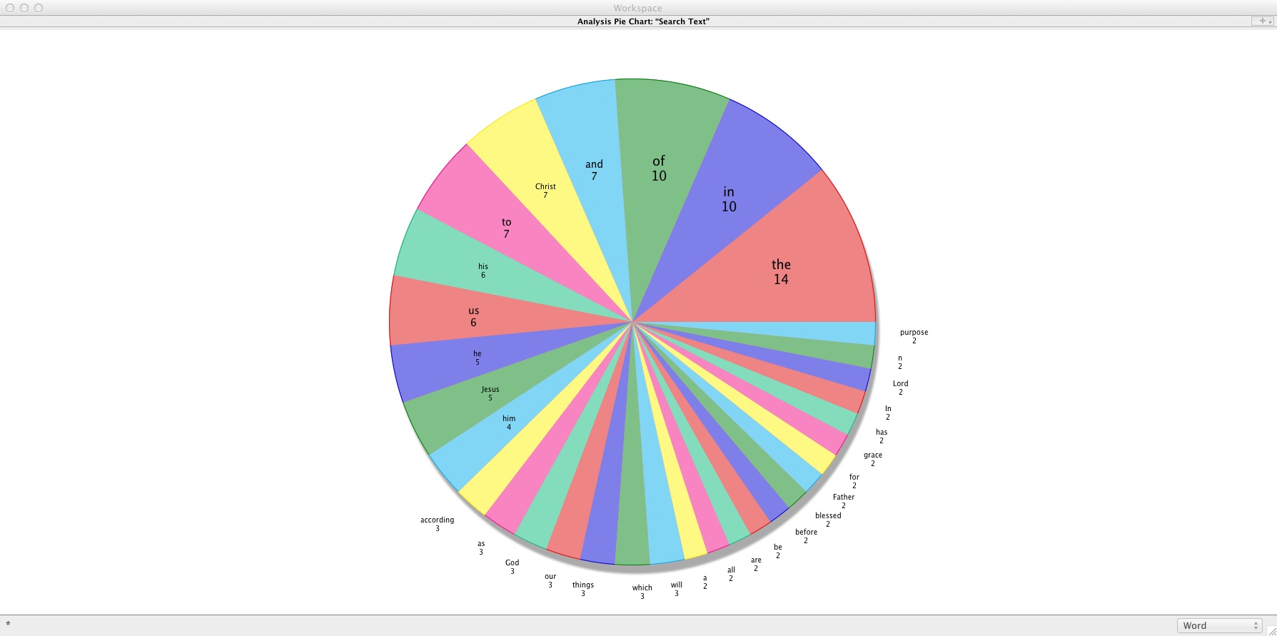 For those familiar with Accordance, simply run an asterisk (*) search in the limited text range you want, and then display the “Search Details” and choose, for example, the “Pie Graphic.” In this example, you would select “Display Words” rather than “Key Number” to get a visual graphic of every word in that range as I have done in my search here. In addition to the colorfully displayed word-frequency, you also see the word count with all the options to view and organize your search results in anyway you want. In this scenario, I have only shown two of the several display options available. But the flexibility is unsurpassed, ranging from the option of creating these different types of visual analyses to generating a true textual concordance in English, Greek, Hebrew, or any other language present in your Accordance library. This, to me, is quite amazing and very practical!
