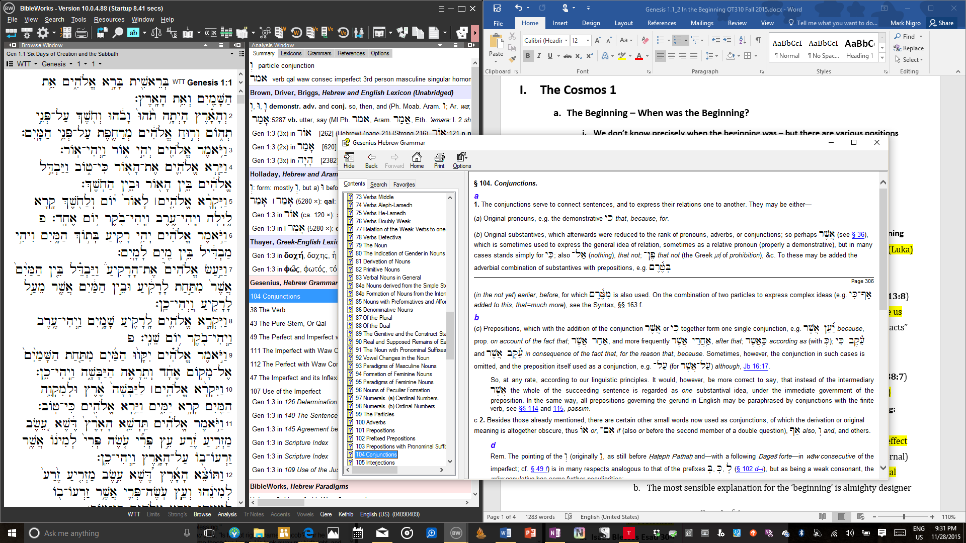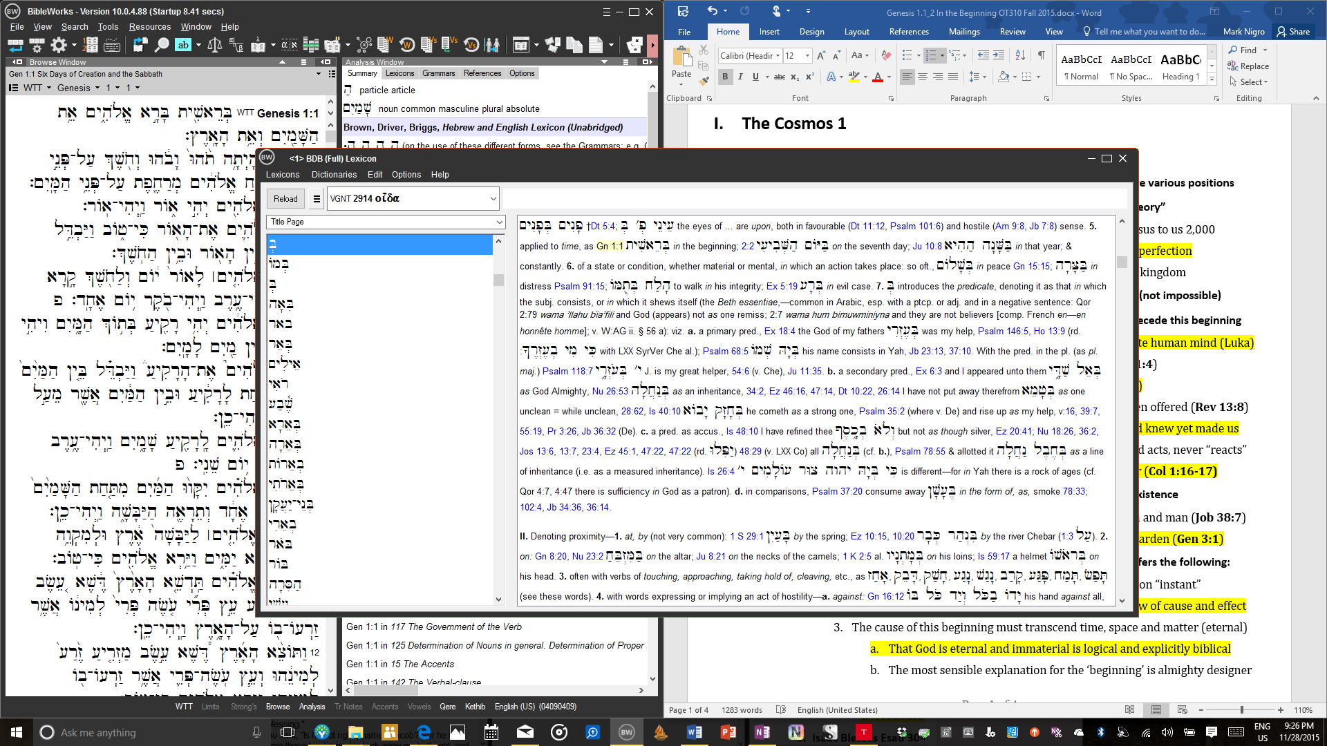 I do this while making modifications to my notes directly in Microsoft Word, snapped to the right of BW.  Even when the “Search” pane is closed in BW, a simple keyboard shortcut allows the user to enter search commands or navigate to new passages quickly and without leaving the layout you see above. Simply hit the “Esc” key to prompt BW for your command. Next, type your reference (Gen 31, for example), and hit “Enter.” The new verse location will appear in the “Browse” pane. Not having to physically enter my cursor into the search pane allows me to maintain my layout the way I need it while moving along quickly and smoothly in my workflow. I do much more with BW for my study needs, but future installments will cover that.